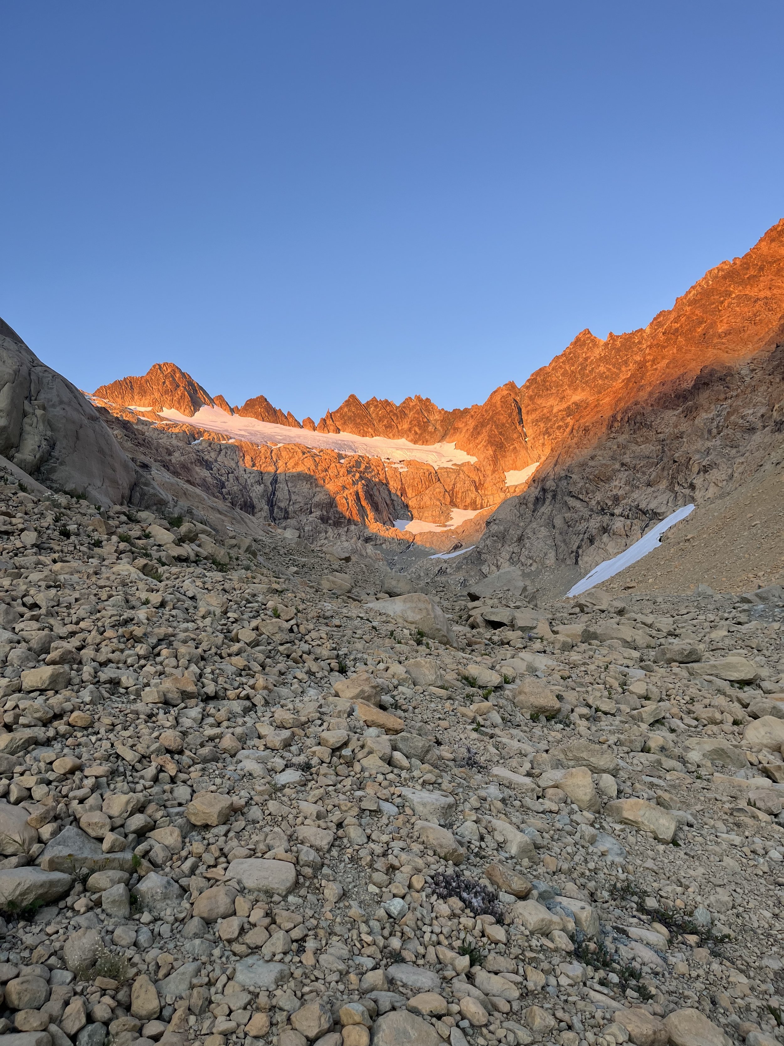 The Twin Sister Range seem to be one of those mountain ranges that everyone notices, but no one remembers. It’s plainly visible from multiple places in western Whatcom and Skagit Counties, and even more so when I’m watching the sunset behind them from a bivouac on Kulshan. The range is made of dunite - this golden orange and red rock laced with green olivine, some of the most concentrated and pure olivine in the world. This gives it a friction like 40 grit sandpaper. The glaciers are some of the lowest west of the Cascade divide, so they’re also in retreat and melting fast. The range is also relatively low elevation compared to the North Cascades: summits are 6400 feet to 7000 feet, and campsites are 3400 feet to 4000 feet. So clothing needs to be durable, ice axes and crampons can be lightweight, and insulation can be minimal.