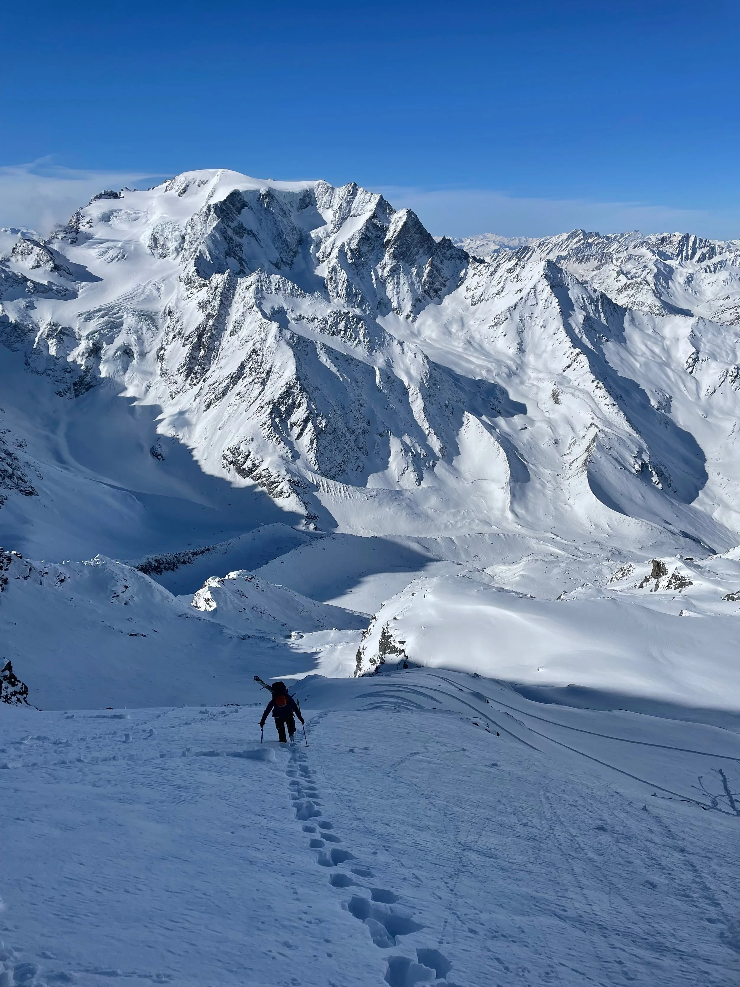 The Haute Route. The tour from Chamonix to Zermatt is the OG, covering over 120km and 8000-10,000m elevation climbed and skied. While it starts in France, all of the huts are managed by the Swiss Alpine Club, and the tour runs through the unique canton (state) of Valais/Wallis. There is a moment on the tour when the cabane become hütte, and the French rolls into German. The views and camaraderie along the tour, however, doesn’t change.